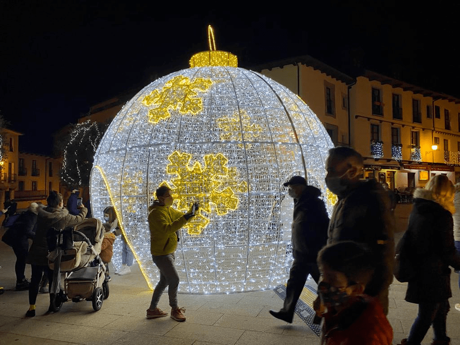 La bola de Navidad luminosa y transitable por su interior, instalada en la plaza de la Encina, supone la gran novedad de cara a la temporada festiva y así la han recibido los ponferradinos que han paseado por el centro de la ciudad este fin de semana.