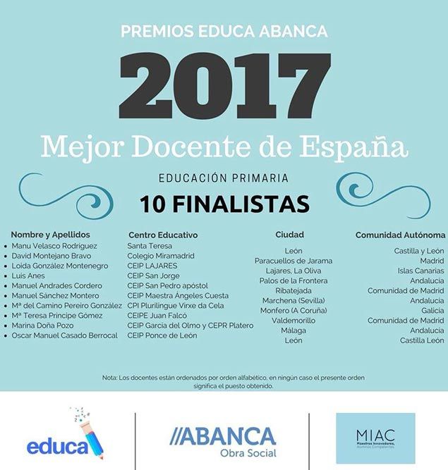 El reconocido profesor berciano Manuel Velasco, natural de Toreno, es finalista de uno de los premios docentes más prestigiosos, los Educa Abanca al Mejor Docente de España 2017. Nominado por su trabajo en el Colegio Santa Teresa de León, Velasco ya ha tenido otros reconocimiento como el premio al mejor blog de E-Learning de España y Latinoamérica, el premio EE.CC. Castilla y León 'Maestro Ejemplar' junto a Vicente del Bosque, el premio Espiral, el premio Manzana de Oro La Eduteca o el premio Educa. Para completar su palmarés, fue nombrado el pasado jueves embajador del Talento de la Fundación Promete.Velasco asegura que estamos viviendo un momento de cambio en el ámbito educativo "gracias a docentes maravillosos que saben que lo realmente importante es que nuestros alumnos sepan aplicar y utilizar los conocimientos en su vida real y durante toda su vida". "Es fundamental que lo hagan y que lleguen a ser personas capaces de autogobernarse a sí mismos, capaces de utilizar sus conocimientos y habilidades para generar cambios, solucionar problemas y mejorar el mundo. Son docentes que cuidan mucho la asignatura de la que más aprenden los alumnos y que se llama Ejemplo, y que conjugan todos los días los verbos dar, compartir y confiar", asegura.