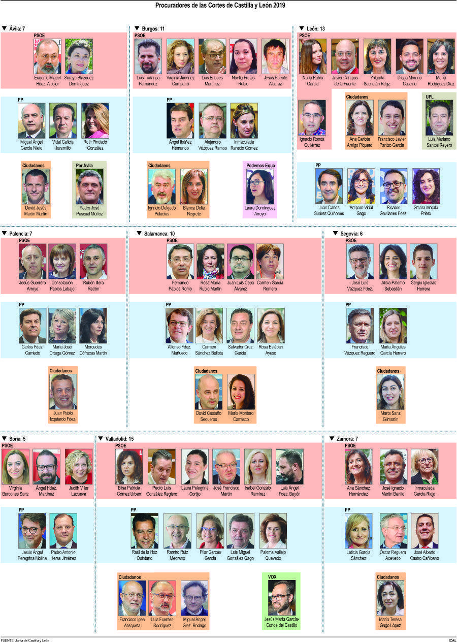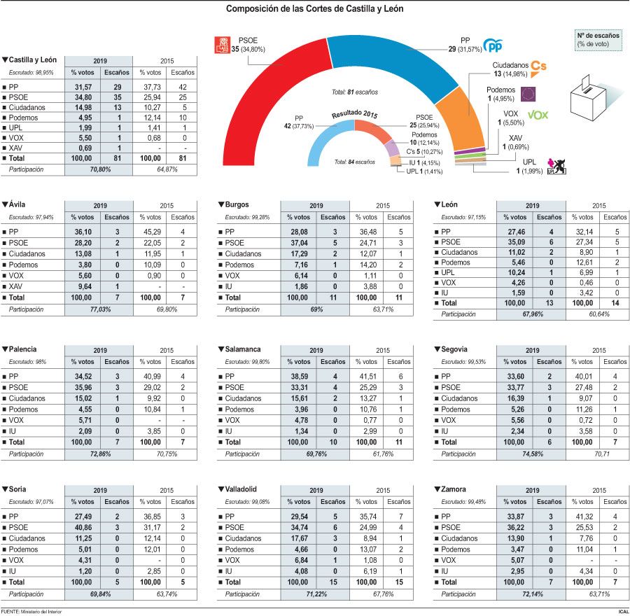 El PSOE volvió a ganar las elecciones en Castilla y León, 36 años después de su victoria en las primeras autonómicas celebradas en 1983. Los socialistas han logrado 35 procuradores, nueve más de los que se sientan en las Cortes actualmente, y supera por tres representantes al PP, que consigue 29 escaños, es decir, trece menos de los que tuvo la pasada Legislatura. No obstante, los trece escaños que alcanza Ciudadanos le convierten en la llave del próximo Gobierno autonómico y de unas Cortes en las que saldrá IU y entrará Vox con un parlamentario, que tendrá que compartir Grupo Mixto con un representante de UPL, que mantiene su actual escaño, otro de la formación localista Por Ávila y otro de Podemos, que se deja en estos comicios nueve de las diez actas que tenía.