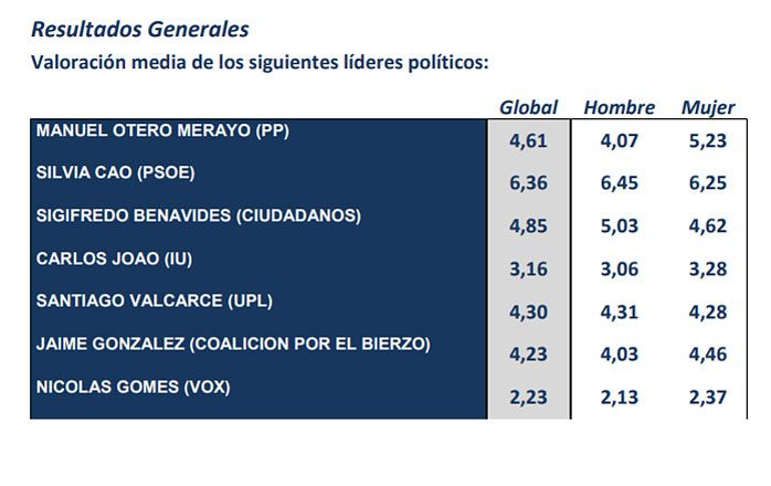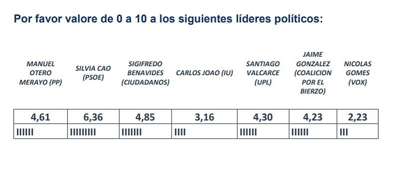 En cuanto a la valoración de líderes, solo aprueba la socialista Silvia Cao con un 6,36. Sigifredo Benavides (Cs) obtiene un 4,85 rozando el aprobado; al igual que Manuel Otero (PP) con 4,61; Santiago Valcarce (UPL) un 4,3; y Jaime González (CB) un 4,23. Entre los 'suspensos', los menos valorados son Carlos Joao (IU) con un 3,16 y Nicolás Gomes (VOX) con un 2,23.