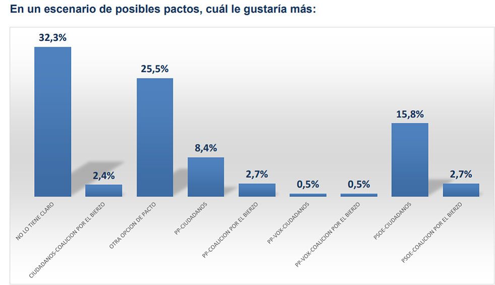En el escenario de pactos, un 15,8% de los bembibrenses prefieren la opción PSOE-Cs, seguida de PP-Cs (8,4%). El resto de pactos ofrecidos cuentan con menos de un 3% de apoyo; el 32,3% no lo tiene claro y el 25,5% prefiere otra opción de las propuestas (Cs-CB, PP-CB, PP-VOX-Cs, PP-VOX-CB y PSOE-CB).