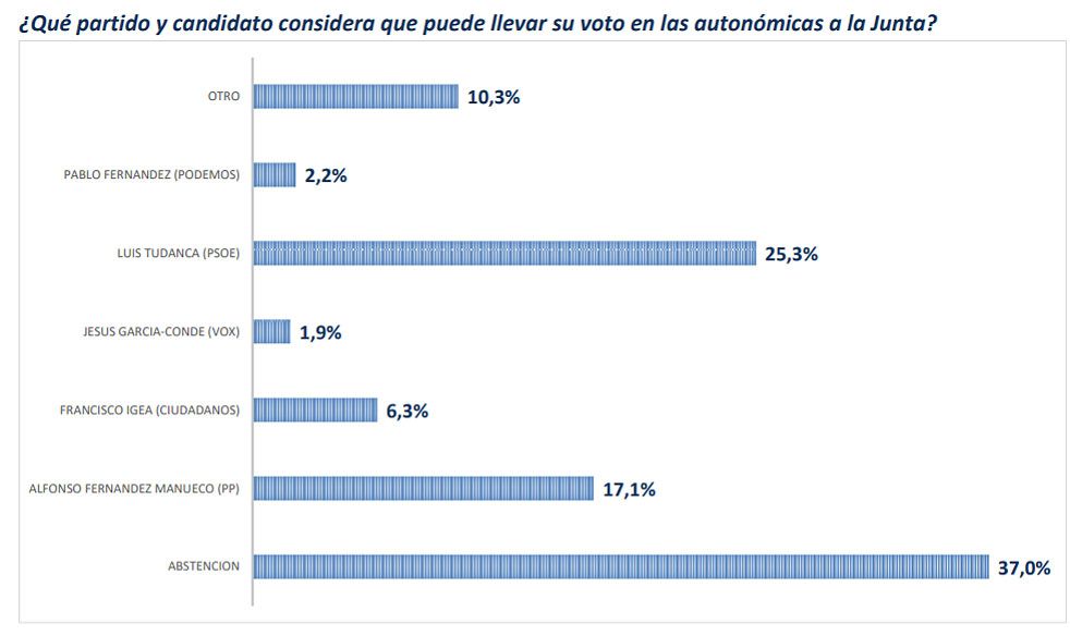 Respecto a las elecciones autonómicas, un 37% opta por la abstención y un 25,3% por Luis Tudanca (PSOE). Le sigue con un 17,1% Alfonso Fernández Mañueco (PP); Franciso Igea (Cs) con un 6,3%; Pablo Fernández de Podemos con un 2,2%; y Jesús García-Conde de VOX un 1,9%. Además, un 10,3% opta por otro partido y candidato.