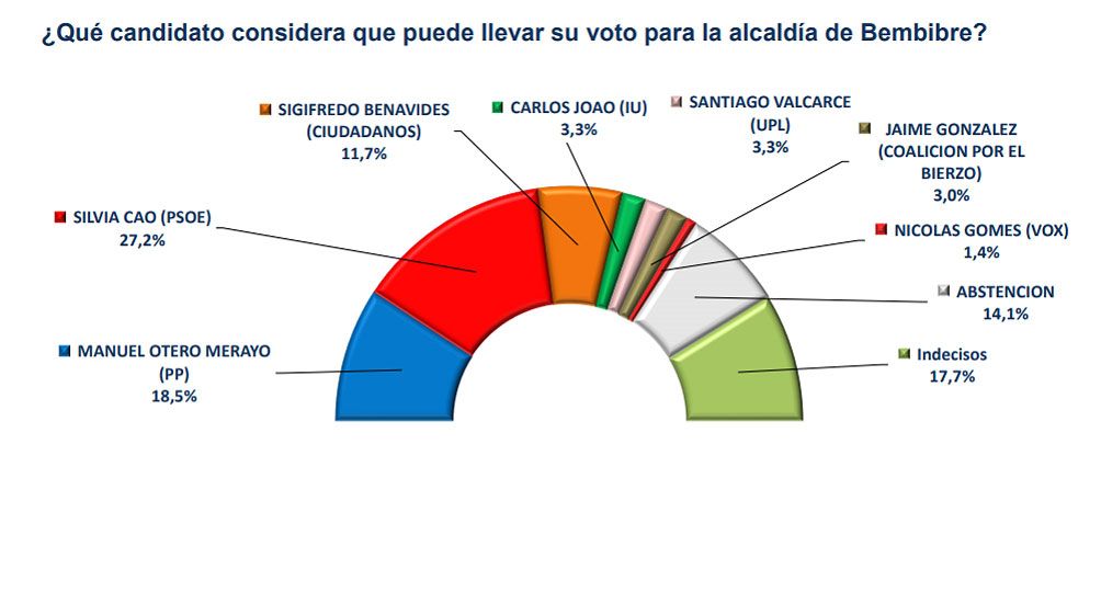 En la capital del Bierzo Alto un 27,7% de los encuestados en el sondeo elaborado por la empresa Huaris para InfoBierzo, se decantan por la candidata del PSOE (Silvia Cao), seguida por el candidato del PP, y actual alcalde, Manuel Otero. A continuación Ciudadanos, con Sigifredo Benavides al frente, recibiría el 11,7% de los apoyos del electorado. Le siguen con un 4% IU (Carlos Joao) y cierran UPL con 3,3% (candidatura de Santiago Valcarce) Coalición por El Bierzo (con el regreso de Jaime González) un 3% y VOX (Nicolás Gomes) un 1,4%.