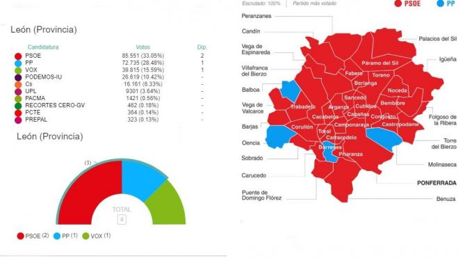 Las Elecciones Generales de este 10 de noviembre arrojan datos en la provincia de León que, con el 100% del recuento del escrutinio procesado y 262.607 votos sumados, darían la victoria al PSOE con el 33,44% de los votos, 86.808 electores y 2 diputados, seguido del PP con 73.960 votos (28,49%) y 1 diputado y, a continuación Vox con 1 diputado y 40.513 votos (15,61%) para la agrupación. Le sigue Podemos-IU, que suma 27.062 votos, que suponen el 10,42%. Ciudadanos ha sufrido el desplome más importante pasando de ser la tercera fuerza más votada en las pasadas elecciones delo 28 de abril a ser la quinta. La agrupación naranja suma 16.451 votos con porcentaje de 6,34% y la consecuente pérdida de un diputado.