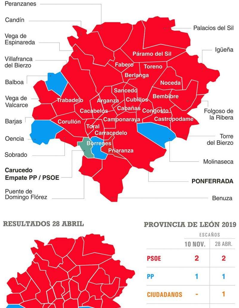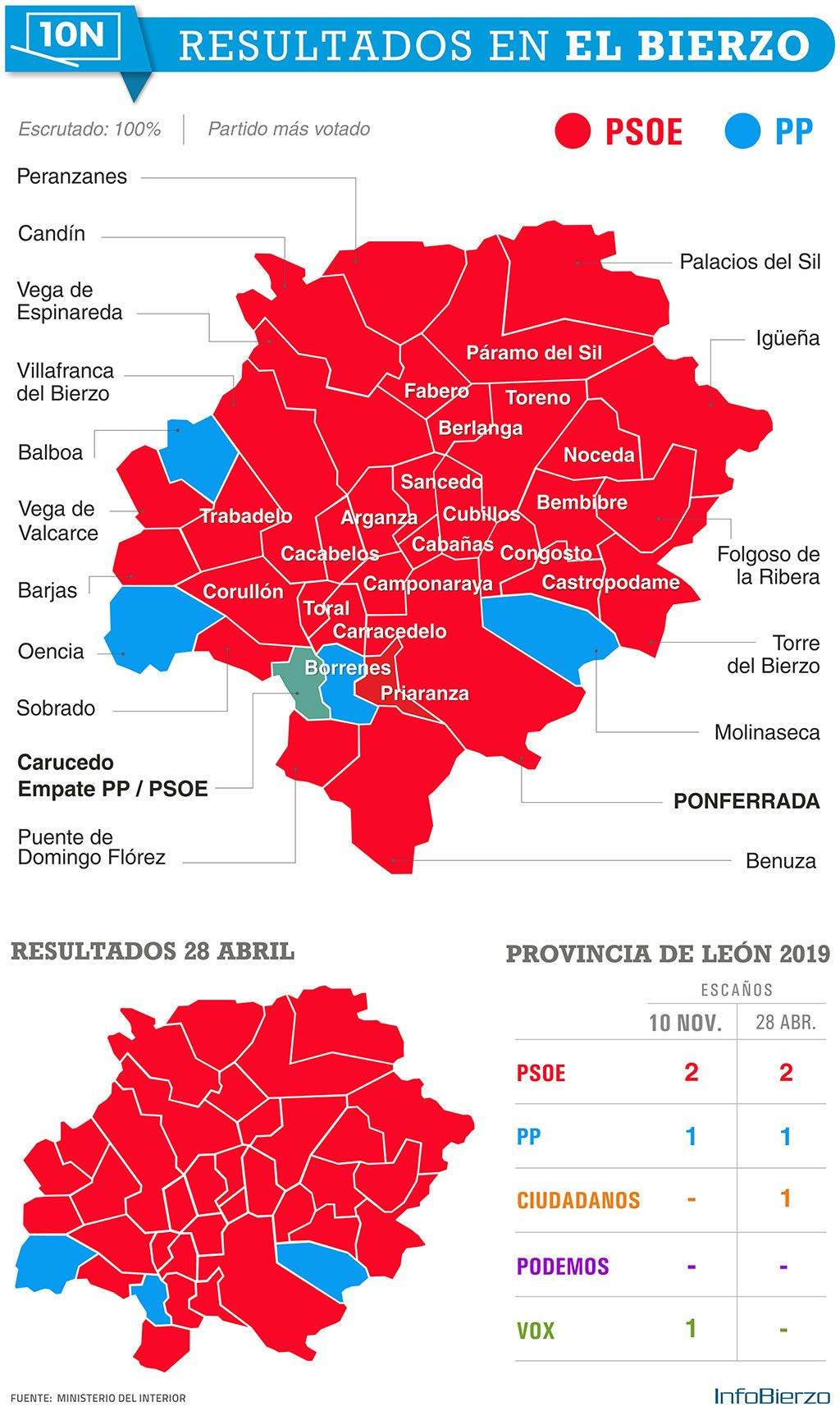 Las elecciones generales del 10 de noviembre dejan un mapa político en El Bierzo muy similar al de los comicios del 28 de abril. La comarca sigue siendo predominantemente socialista, y el Partido Popular solo arrebata el liderazgo al PSOE en Molinaseca, Borrenes, Oencia y Balboa. Podemos es la tercera fuerza política en casi todos los municipios, aunque Vox ha subido notablemente en la comarca y se cuela en el 'top 3' de algunos escrutinios. Por su parte, Ciudadanos cae estrepitosamente en El Bierzo, desplomándose hasta el quinto lugar en todo el territorio berciano.