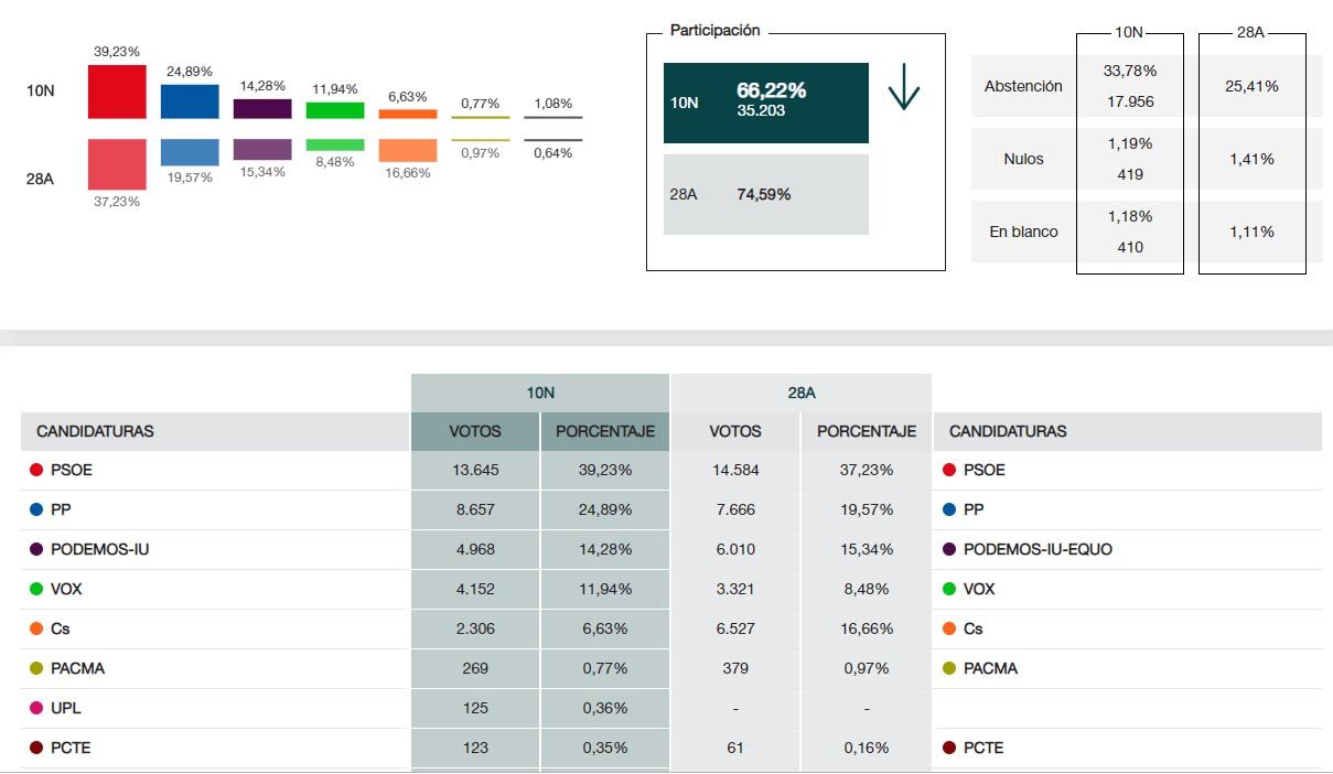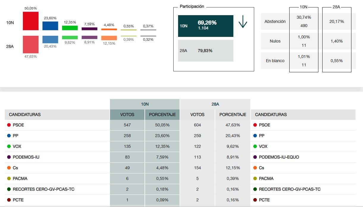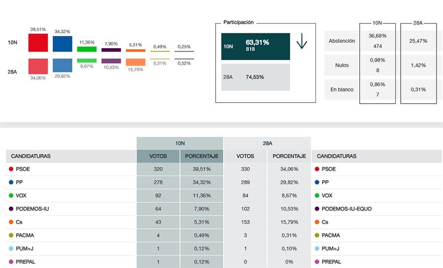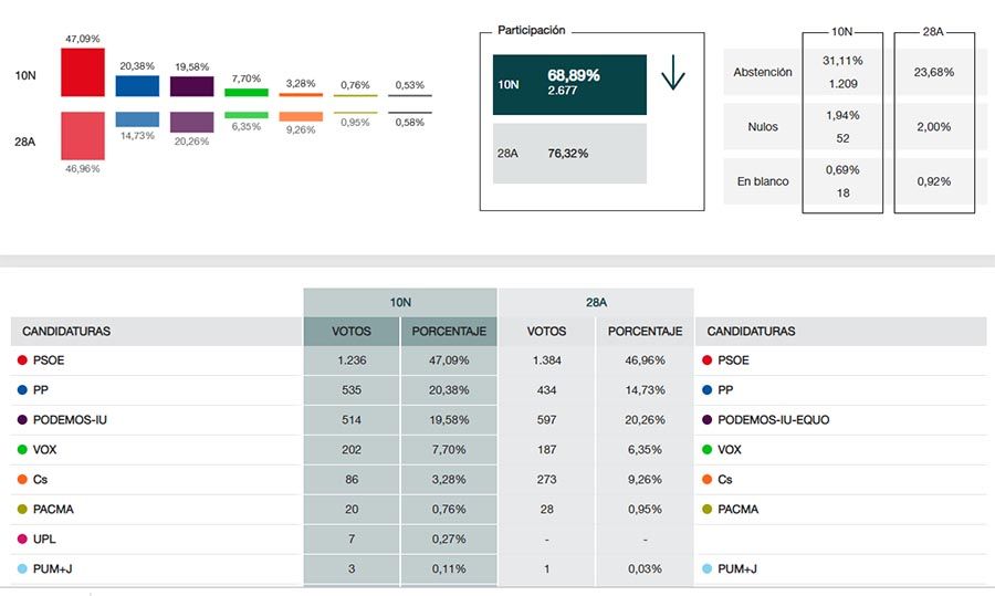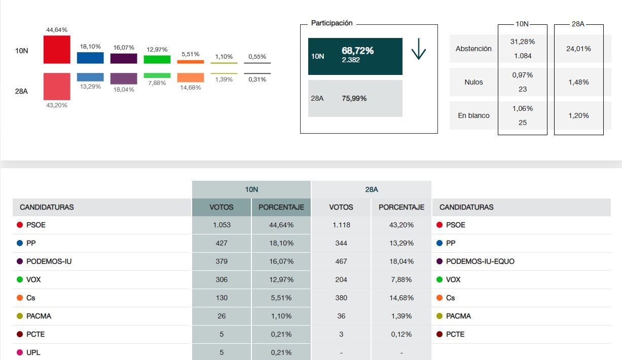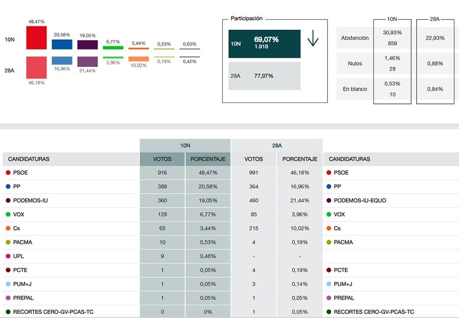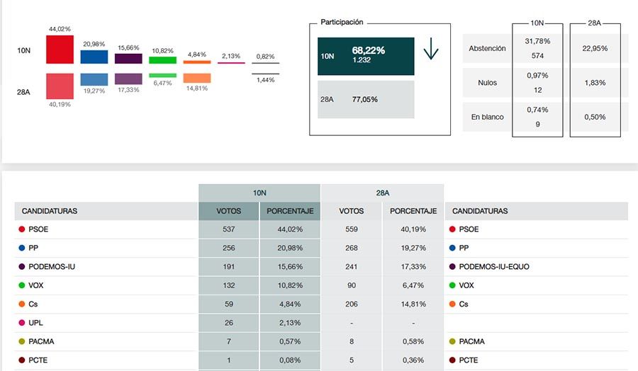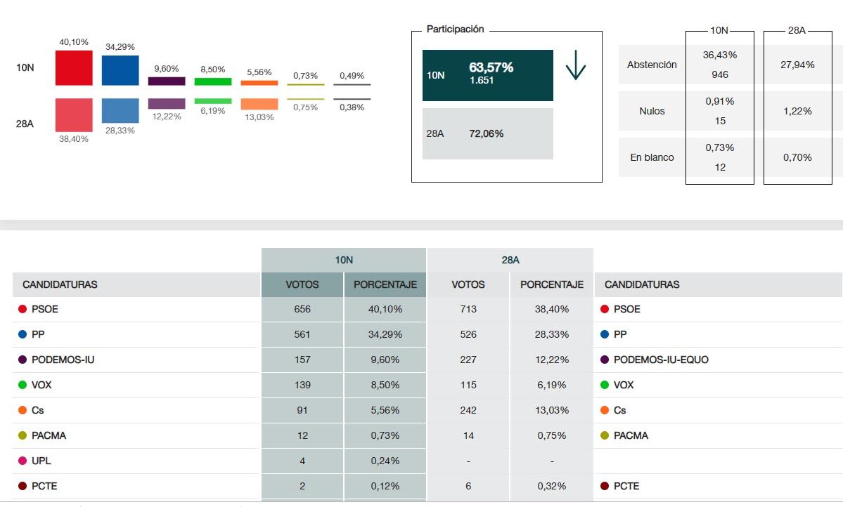 Fabero también teñido de rojo: 77,09% y 1.236 votos para PSOE con el 100% escrutado, resultado prácticamente idéntico al del 28A (46,96%). El PP suma 535 votos (20,38%) subiendo 5 puntos sobre el 14,73% recibido en las elecciones de abril. Podemos sigue pisando los talones a los populares con un 19,58% y 514 votos, cerca del 20,26% registrado en los anteriores comicios. Vox se cuela en cuarto lugar con un 7,70% (202 votos), aunque crece solo 1 punto. Ciudadanos suma solo 86 votos en Fabero (3,28%) y se precipita respecto al 9,26% de abril. La participación ha sido del 68,89% con 2.677 votantes, cuando en los comicios precedentes la cifra fue del 76,32%. En cuanto a la abstención, en el 10N ha sido del 31,11%, subiendo notablemente sobre el 23,68% de abril.