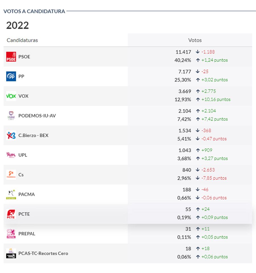 Carracedelo: Con el 100% escrutado, el PSOE se posiciona como primera fuerza con el 42,35% de los votos (764 votos), el PP responde al 30,88% (557 votos), VOX recoge el 10,92% de los votos (197), Unidas Podemos IU-AV registra 120 votos (6,65%), UPL con el 3,55% de los votos (64 votos), Ciudadanos con el 2,61% de los votos (47) y el resto de votos (2,33%) corresponden al resto de partidos.