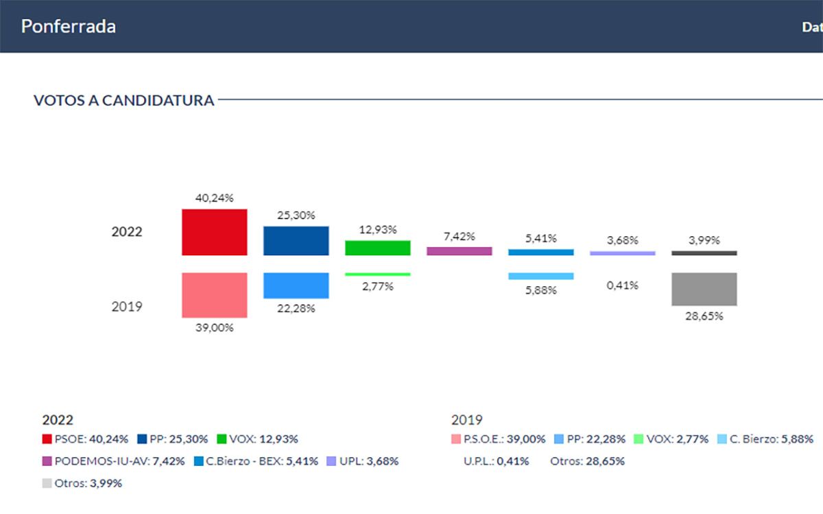 Ponferrada: Con el 100% escrutado, en Ponferrada el 40,24% de los votos (11.417) pertenecen al PSOE, el PP 25,30% (7.177) votos, el 12,93% (3.669) responden a VOX, el 7,42% pertenece a Unidas Podemos con 2.104 votos (7,42%), a Coalición Por El Bierzo pertenecen el 5,41% (1.534 votos), 3,68% responde a UPL (1.043 votos) y el 3,99% responde a otros partidos con 1.132 votos.