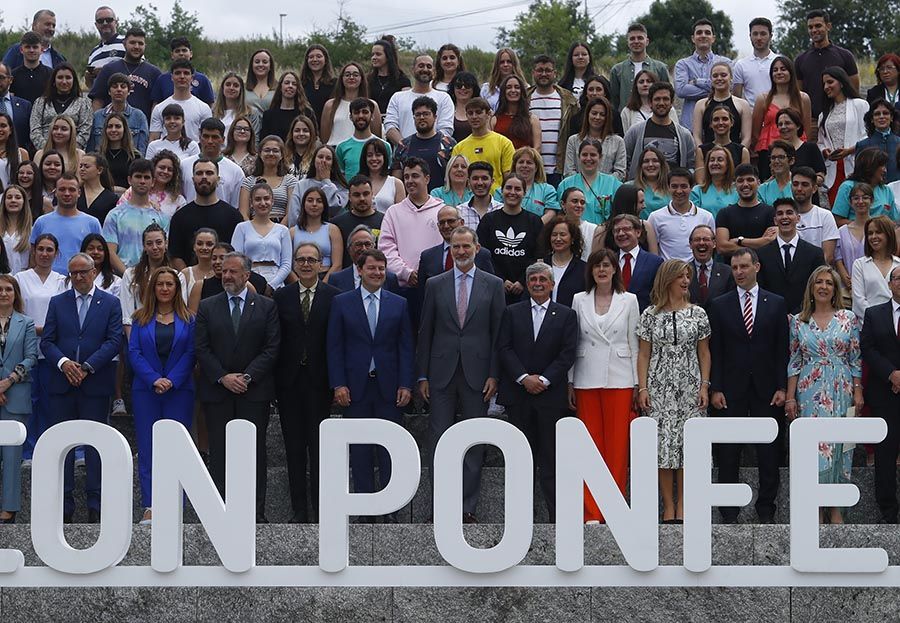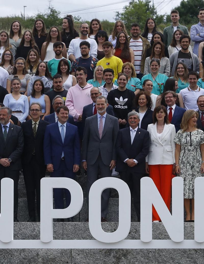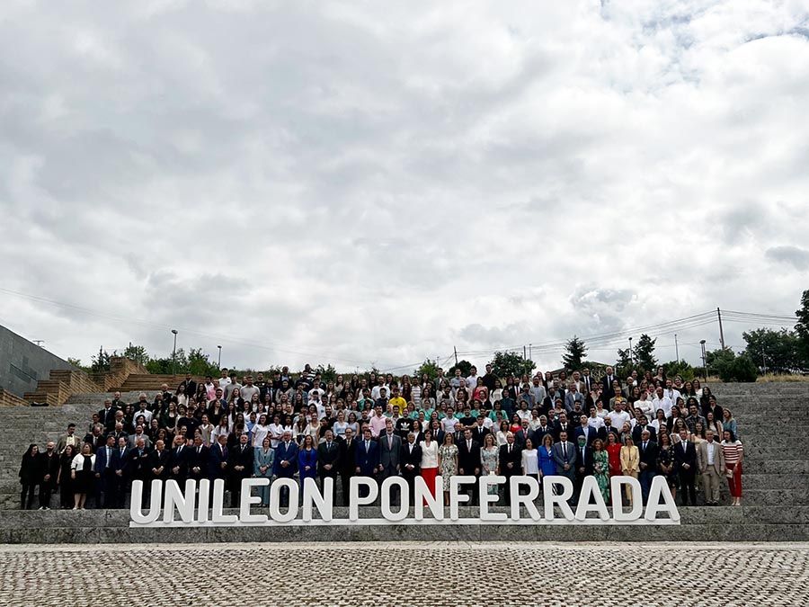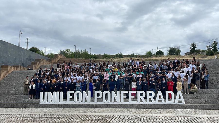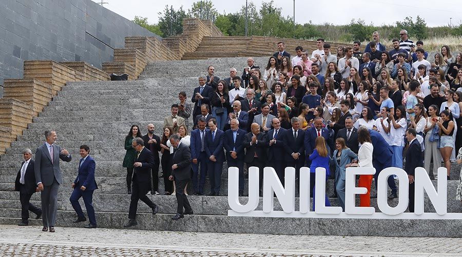 Ya a la salida del Campus posó con representantes autonómicos, provinciales, regionales y locales, además de muchos alumnos de la universidad, detrás de un enorme cartel con las letras de "UNILEON PONFERRADA".