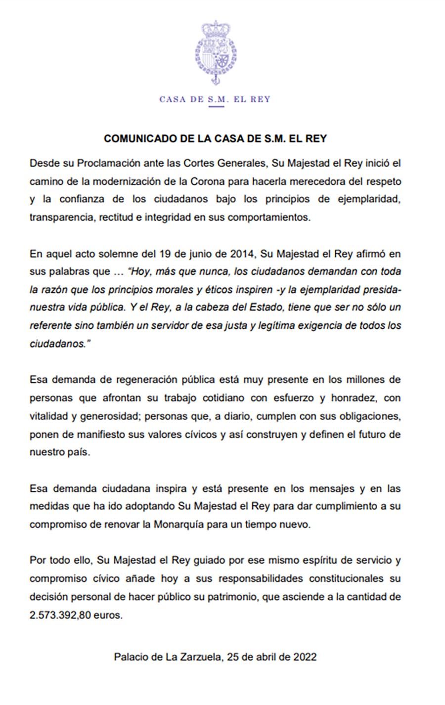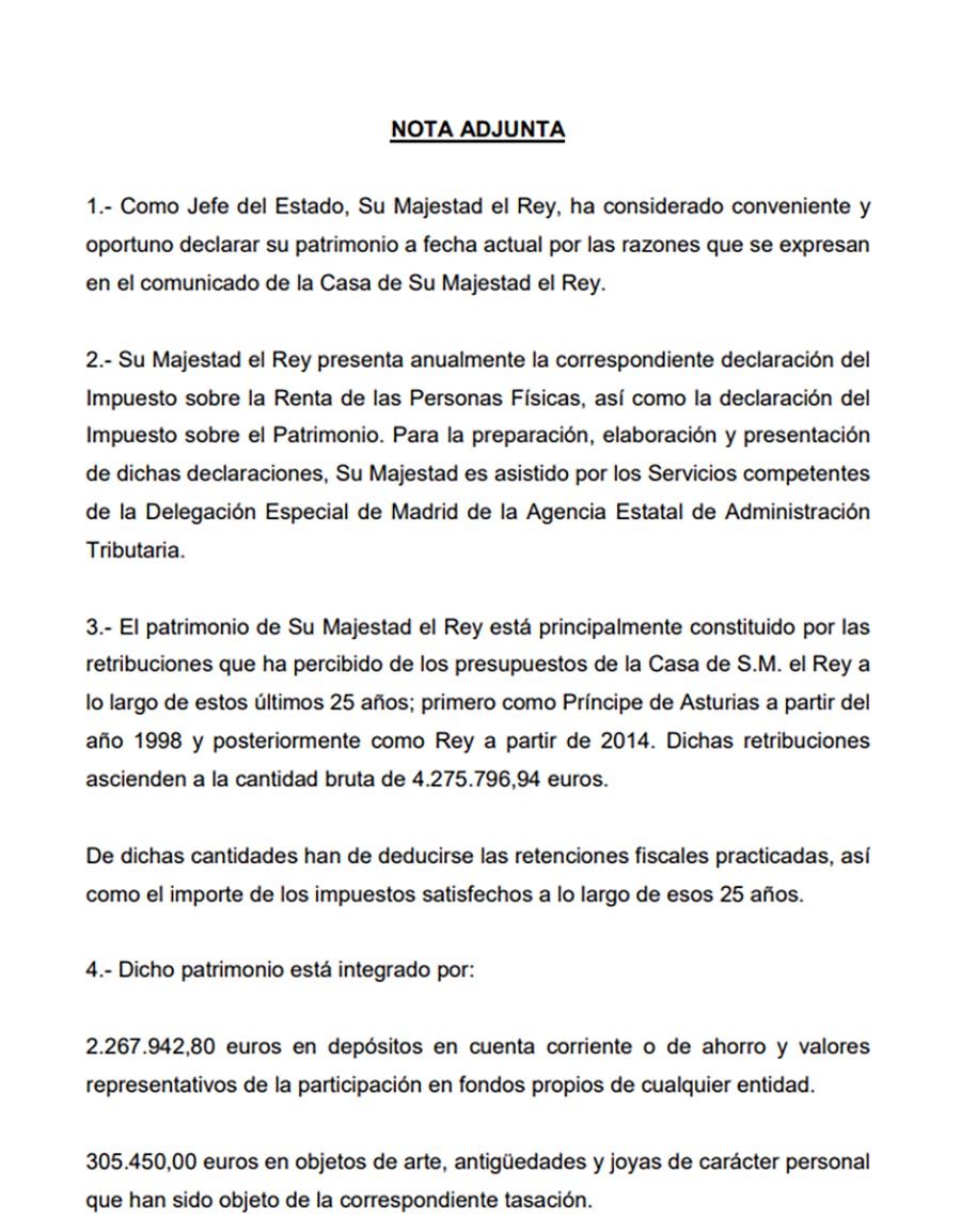 El actual rey de España, Felipe VI, hace público por primera vez su patrimonio personal, que según la Casa Real, sería de un total de 2.573.392,80 euros, tal y como constata la agencia Europa Press.