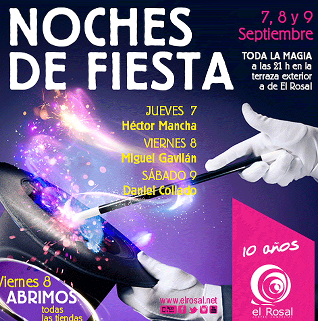 El Centro Comercial El Rosal acogerá en estas Fiestas de la Encina tres veladas “mágicas” para el deleite de los más pequeños y de toda la familia. Serán los días 7, 8 y 9 de septiembre, desde las 21:00 horas, en la terraza del recinto.
