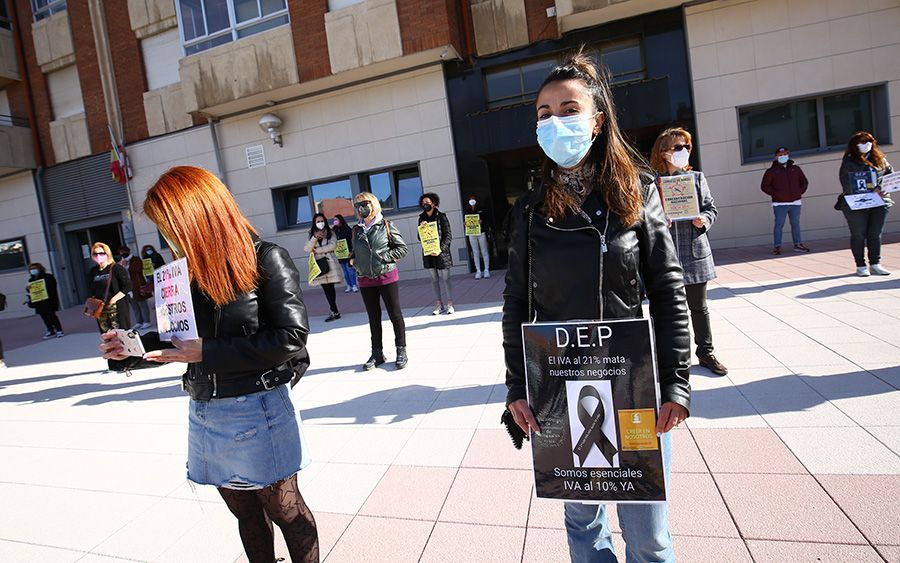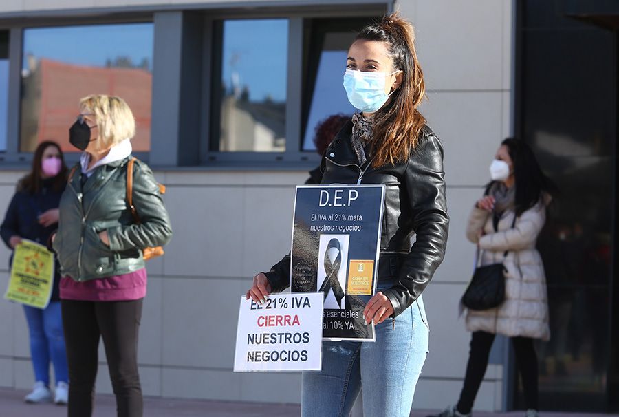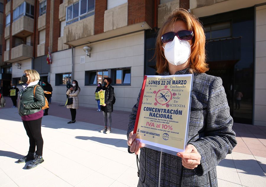 El sector de peluquería y estética del Bierzo y Laciana se concentró en la mañana de este lunes frente a la sede de Hacienda en Ponferrada para reivindicar una reducción del IVA al 10%, pues a pesar de ser considerado un sector esencial, se les aplica un IVA "de lujo" de un 21%.