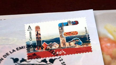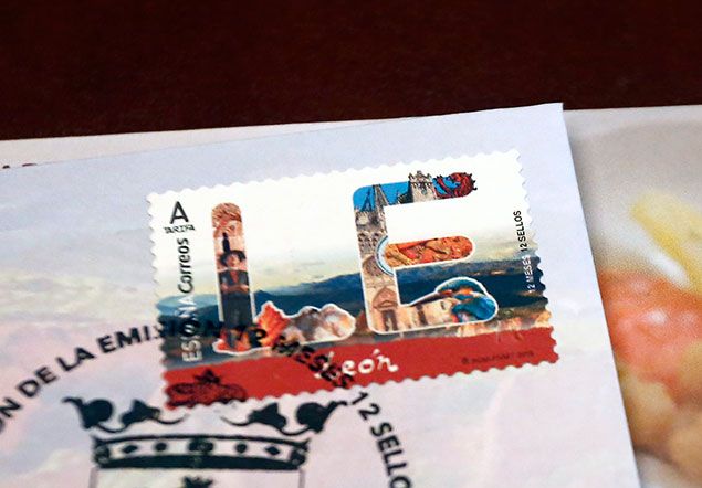Las letras L y E son las protagonistas del sello y cada una de ellas incluye una 'collage', que en el caso de la segunda tiene como elemento principal la portada de la catedral de Burgos y no la de León, como era la intención de Correos.