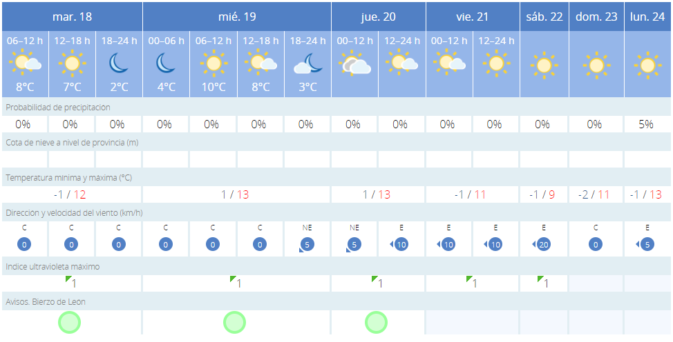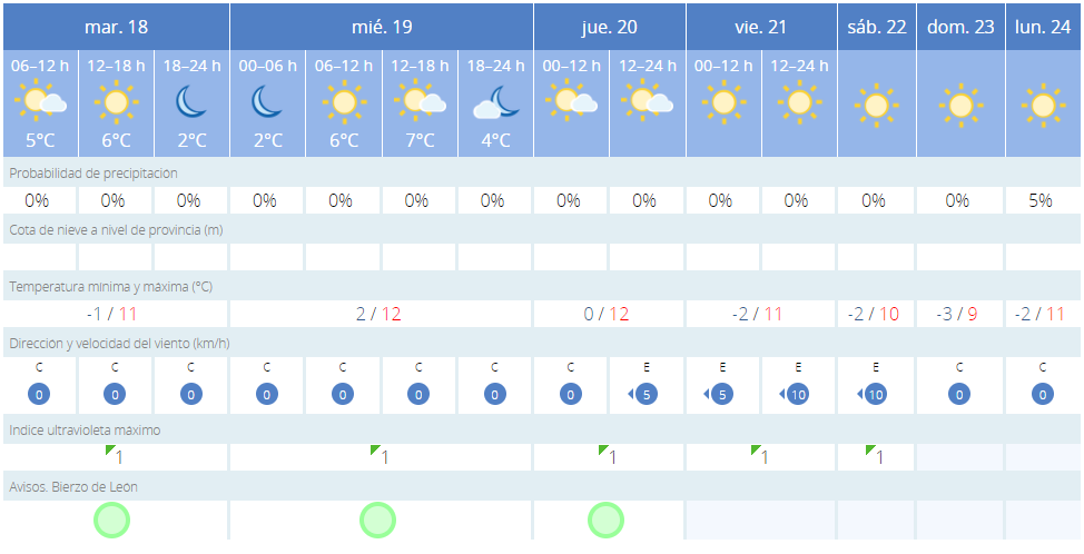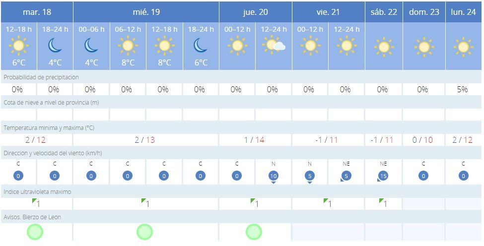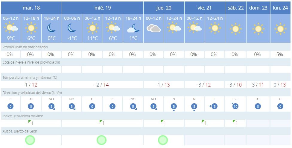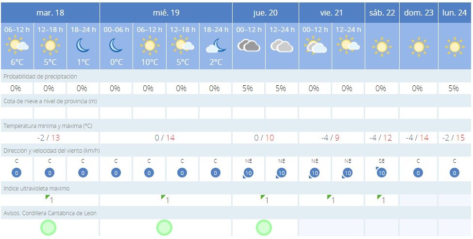 Si miramos hacia Fabero, la cuenca minera deberá abrigarse más que el resto de la comarca, ya que las mínimas se mantendrán bajo cero durante toda la semana. Los cielos serán nubosos y los vientos se harán notar, en especial el viernes 21. De cara al fin de semana, se esperan cielos soleados como en el resto del Bierzo.