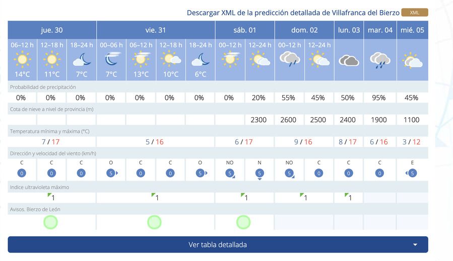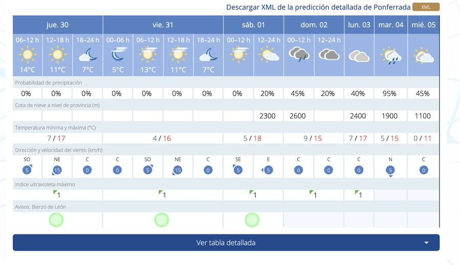 En la capital del Bierzo, predominará el buen tiempo hasta el día 2 de enero, cuando se avecinan lluvias y cielos nubosos de cara al día de reyes, y su día previo (5 enero), cuando los cielos estarán con sol y nubes. Con respecto a las temperaturas máximas oscilarán desde el jueves 30 al 5 de enero entre los 17 grados y los 11. Sin embargo, las temperaturas mínimas, serán bastante bajas, entre los 0 y 9 grados.