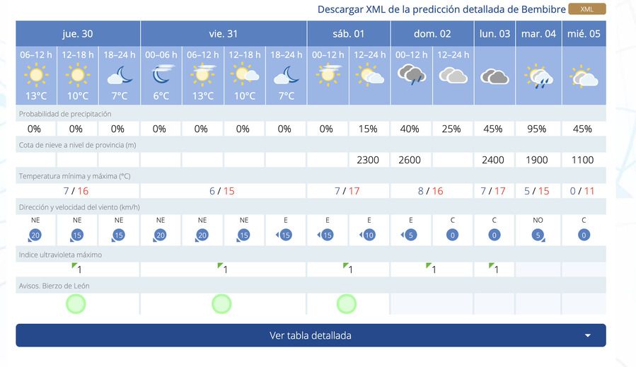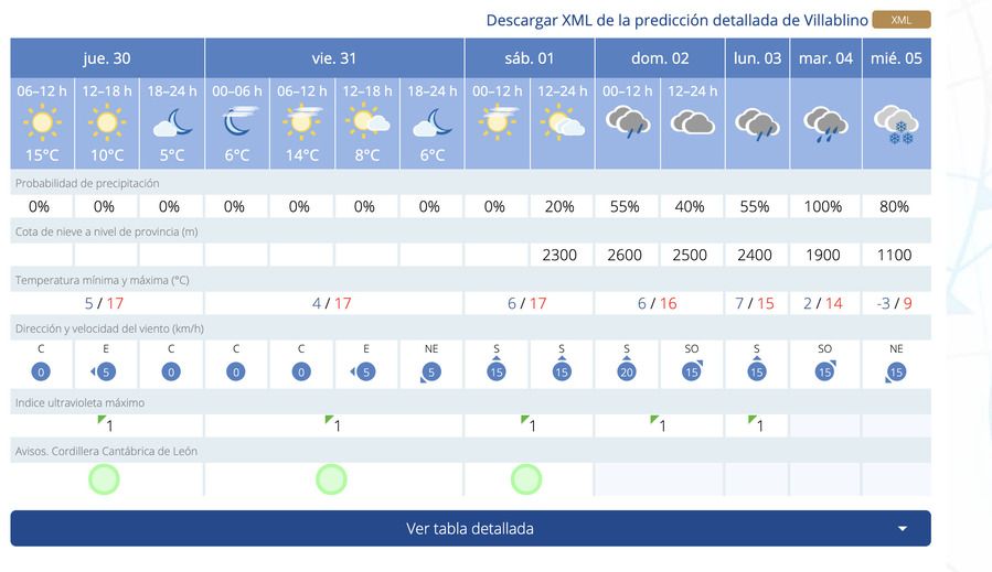 En la capital de la Comarca de Laciana, el Sol será el protagonista hasta el día 2 de enero, cuando las lluvias comiencen a hacer acto de presencia. Además, cabe destacar que el día 5 de enero, existe un 80% de probabilidad de que los copos de nieve lleguen a Villablino. Con respecto a las temperaturas máximas, oscilarán entre los 17 y 14 grados, aunque las mínimas se enmarcan entre los -3 y 7 grados.