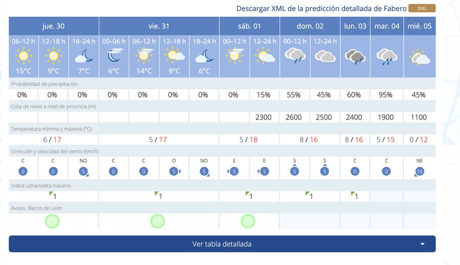 En la cuenca minera de Fabero, el Sol y temperaturas agradables estarán presentes hasta el día 2 de enero cuando las lluvias llenen los cielos mineros. Sin embargo, el día 5 podrá haber una tregua con cielos nubosos. Las temperaturas máximas oscilarán entre los 18 y 12 grados centígrados, mientras que las mínimas se enmarcarán entre los 0 y 8 grados.