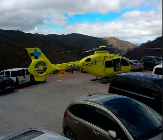 El traslado en helicóptero del 112 al Hospital El Bierzo de un vecino ha sorprendido esta tarde de domingo a los turistas en Peñalba de Santiago. Los visitantes se mostraban asombrados ante la maniobra del helicóptero para aterrizar y aparcar entre el resto de vehículos.
