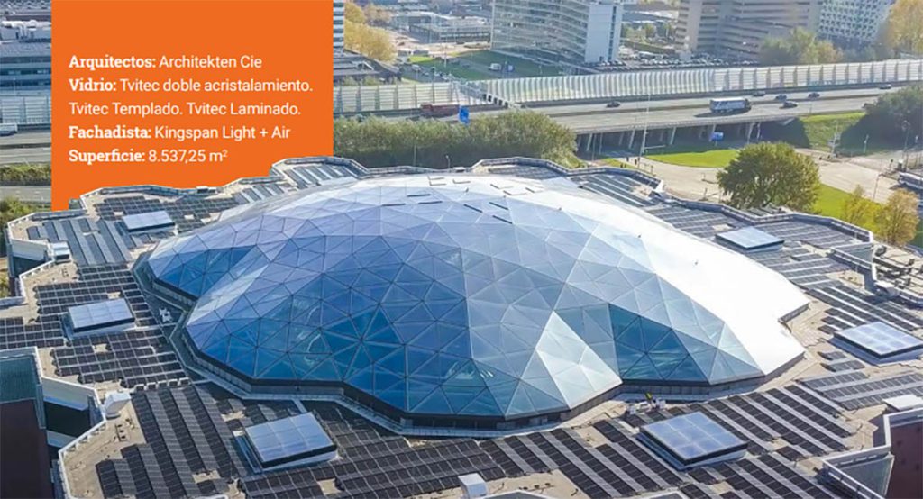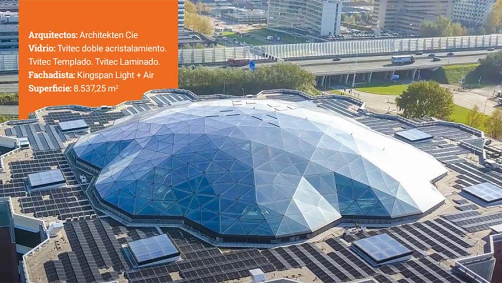 El vidrio de la empresa berciana Tvitec ha convertido la cúpula del Edge Amsterdam West en un captador solar "tan grande como un campo de fútbol", explican desde la entidad. Este proyecto inmobiliario se convierte en un libro abierto de cómo el vidrio de alto rendimiento "puede contribuir a fusionar la tecnología, la arquitectura moderna y sus criterios sostenibles y biofílicos", explica Tvitec.