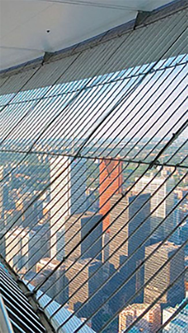 En el interior del laminado, el equipo técnico y de fábrica de Cricursa incorporó una cara bajo emisiva colocada estratégicamente. Y en contacto con dicha capa se laminaron dos electrodos ocultos tras unas bandas serigrafiadas. Estos frágiles electrodos sobresalen del vidrio acabado y sirven para distribuir la energía eléctrica a través del interior del acristalamiento, lo que los convierte en parte capital del producto. Cricursa emplea la tecnología más avanzada para el acristalamiento calefactable de la icónica CN Tower, a 550 metros de altura.