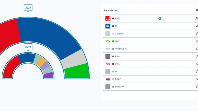 Olegario Ramón (PSOE) remonta a 11 concejales -2 más que los comicios de 2019- pero Marco Morala (PP) se hace con 10 y asciende 4 ediles. Pierde un edil Coalición por El Bierzo al final del escrutinio (llegó a sumar 4), aunque los de Iván Alonso seguirían siendo llave. Podrían sumar mayoría absoluta con Olegario Ramón aunque en los últimos meses de alianza (gobiernan actualmente con el PSOE) han surgido discrepancias, principalmente por la aplicación de la Zona de Bajas Emisiones. Pueden dejar gobernar en solitario a uno de los bloques, y en ese caso la derecha (10 de PP y 2 de VOX) tendría más opciones de ascender a Marco Morala a la alcaldía porque la izquierda se queda sólo con el PSOE, que sumaría 11, tras la desaparición de Podemos, que pierde sus 2 escaños actuales. Lo tuvo por momentos el PRB pero ha terminado por quedar fuera de la Corporación.