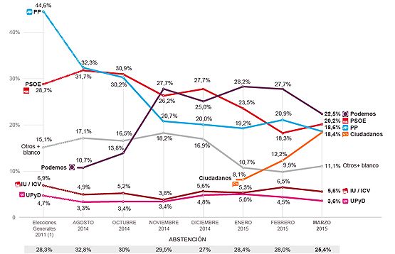 La bajada del PP de dos puntos, con un 18,6%, y la subida de seis puntos de Ciudadanos les aproxima hasta rozarse solo con dos décimas a favor de los populares. La permanencia en el tablero político, aunque muy a la baja, de los dos grandes y la irrupción fortísima de los dos nuevos, arrastra hacia abajo a las dos fuerzas políticas, Izquierda Unida y UPyD