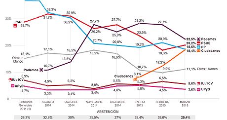 Los dos grandes partidos tradicionales, PP y PSOE y los emergentes, Podemos y Ciudadanos (C’s), se reparten casi el 80% de los votos, según el barómetro del mes de marzo de Metroscopia para EL PAÍS. Las dos nuevas fuerzas políticas apuntan con solidez a su asentamiento definitivo y, como consecuencia, a poner el punto final al largo ciclo político bipartidista.