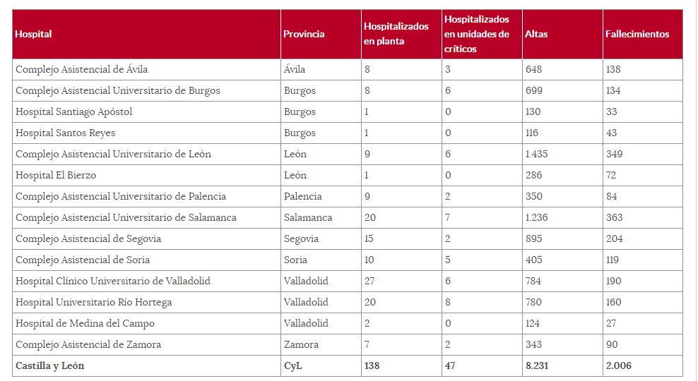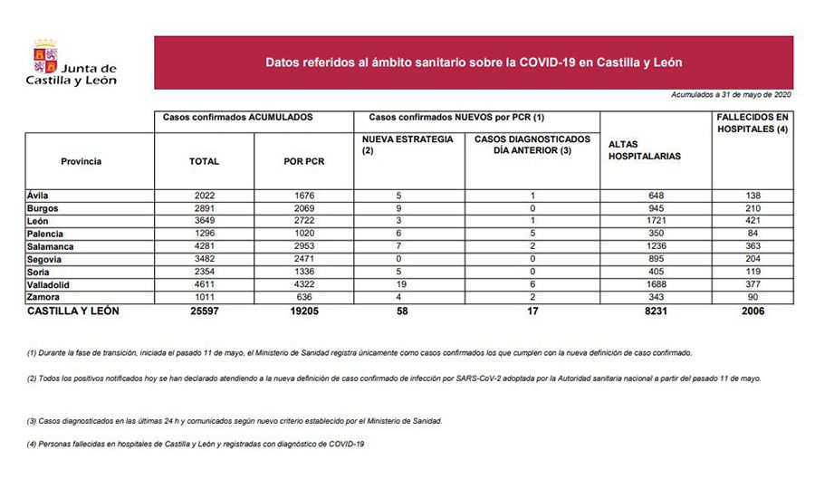 En cuanto a las cifras en Castilla y León, el total de confirmados es de 25.597, sumando 58 casos más la última jornada. Por otro lado, se han producido 3 altas (8.231) y ha habido que lamentar 3 fallecidos (2.006).