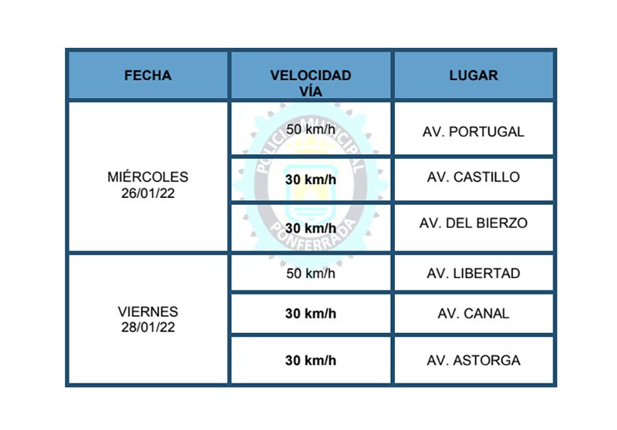Durante la jornada de este viernes 28, la Policía de Ponferrada controlará la velocidad en distintas vías de la capital berciana. Así, efectivos policiales estarán en diferentes localizaciones de la ciudad: en vías de zona a 30km/h se ubicará en la Avenida del Canal y en la Avenida Astorga, mientras que en la zona 50km/h, estará ubicado en la Avenida de la Libertad.