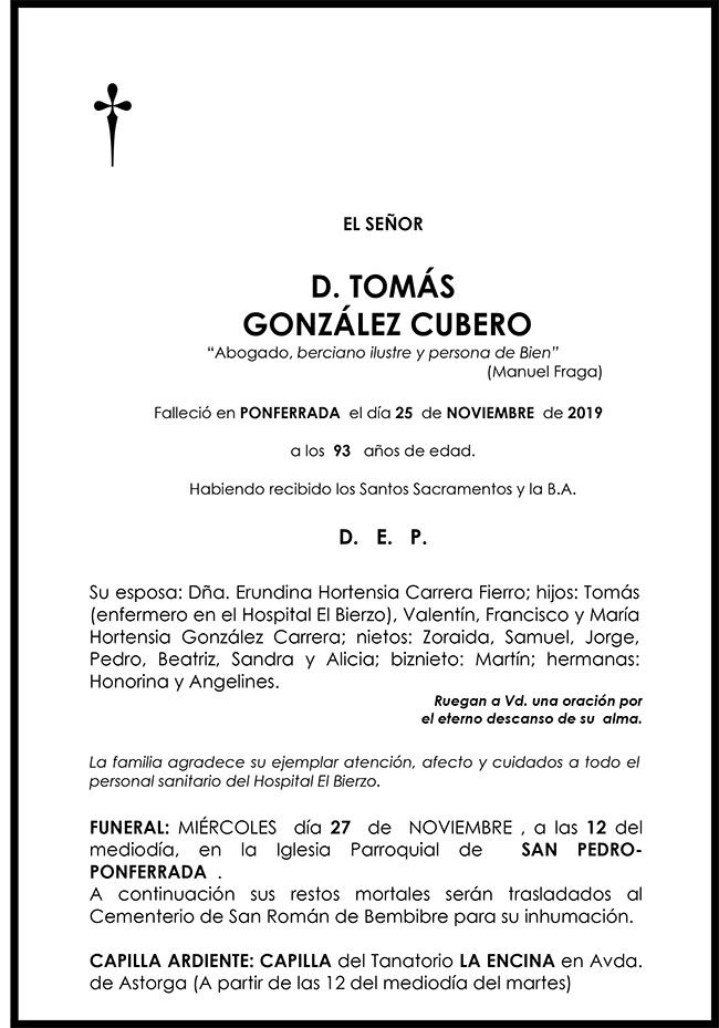 El conocido abogado ponferradino Tomás González Cubero, fundador de Alianza Popular en la comarca del Bierzo a finales de los años setenta, falleció el pasado lunes a los 93 años de edad, según confirmaron fuentes de la familia. González Cubero fue presidente del PP en Ponferrada, vicepresidente provincial, candidato al Senado en 1978 y partícipe de la redacción del Estatuto de Autonomía de Castilla y León.