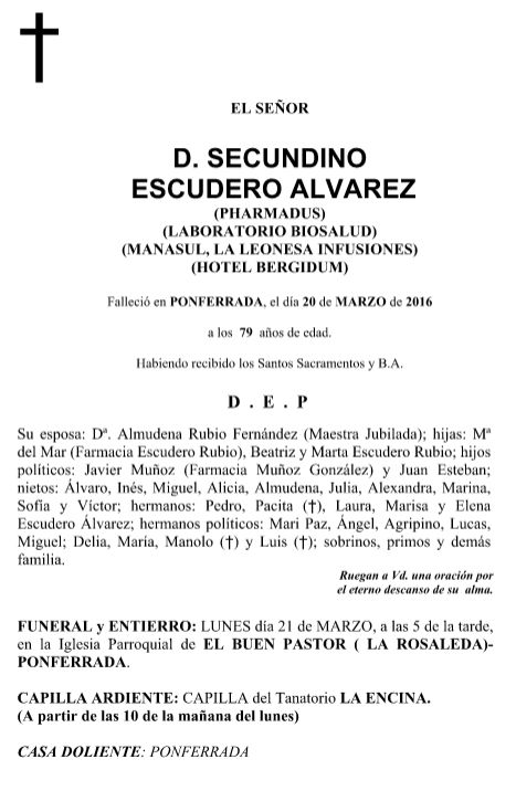 Secundino Escudero en compañía de una de sus hijas, Beatriz Escuredo, actual CEO en PharmadusSecundino Escudero ha sido un referente en el mundo empresarial del Bierzo y de la provincia de León. Cofundador de Infusiones La Leonesa en 1956, Manasul Internacional y posteriormente presidente de Pharmadus (ahora Pharmadus Botanicals), que se afincó hace una década en Camponaraya, “ha sido un ejemplo de hombre emprendedor y trabajador incansable”, destaca la empresa en un comunicado.