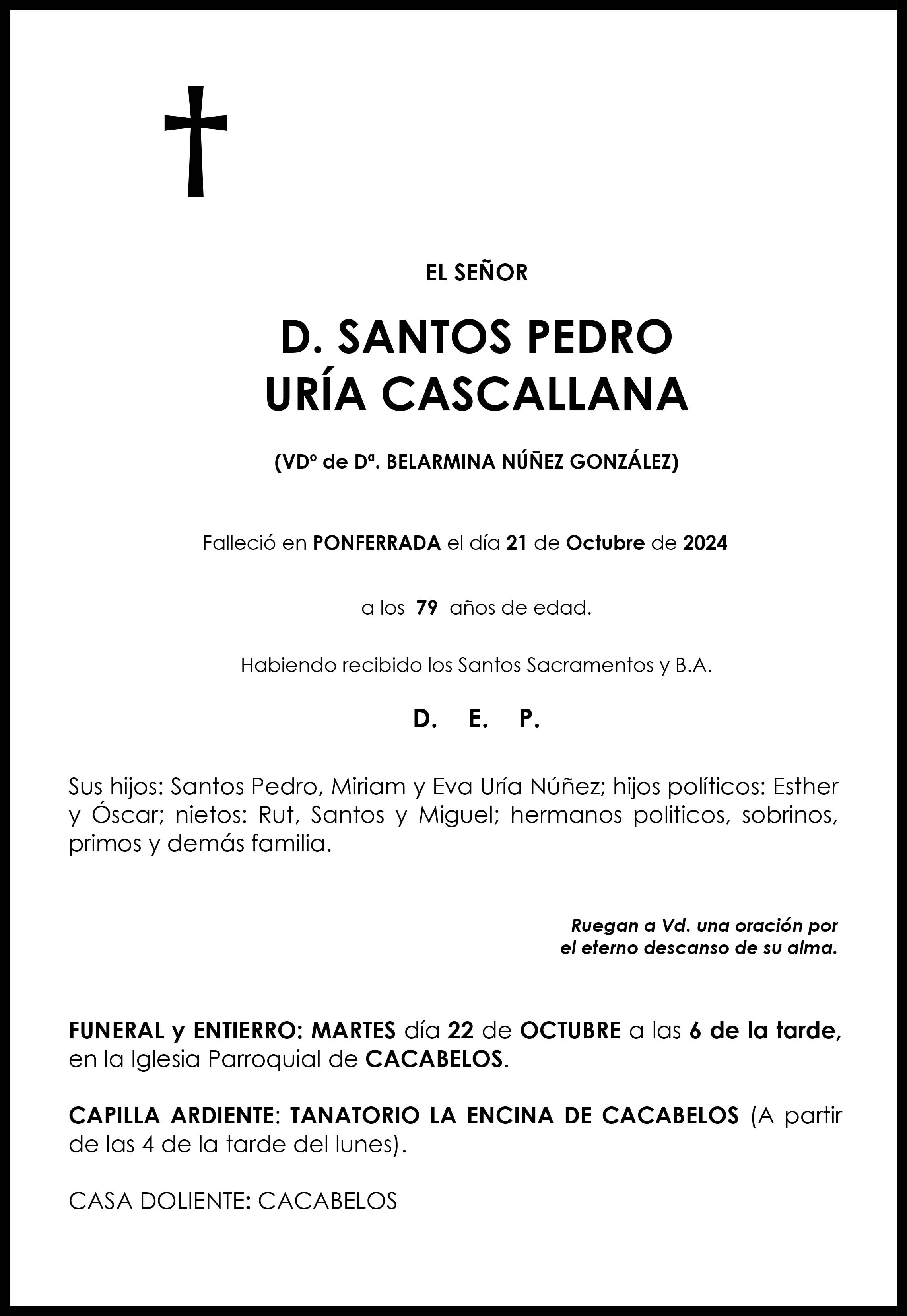 El exalcalde de Cacabelos Santos Uría Cascallana ha fallecido este lunes a los 79 años. El que fuera regidor de la Villa del Cúa y querido profesor por vrias generaciones de ciudadanos del municipio de Cacabelois, será enterrado el martes a las 18 horas en la Iglesia Parroquial de Cacabelos.