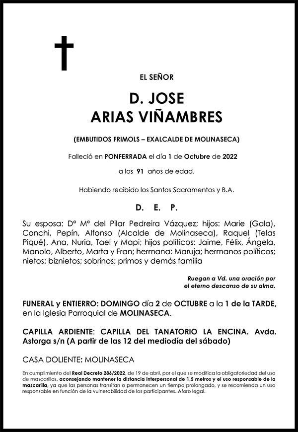El exalcalde del municipio berciano de Molinaseca, José Arias Viñambres, falleció este sábado a los 91 años de edad, según confirmó el PP del Bierzo, que mostró su “profunda tristeza” por la pérdida de “una persona muy respetada y querida por todos en su municipio”.