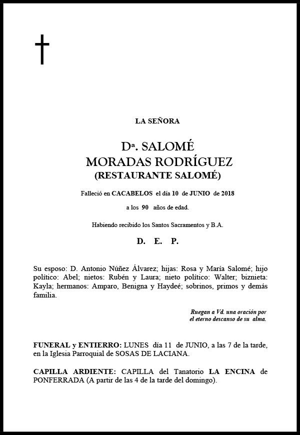 Este domingo ha fallecido a los 90 años Salomé Moradas Rodriguez, la fundadora y propietaria durante décadas de Casa Salomé en Toreno. Casa Salomé es conocido en toda la cuenca minera y fuera de la Comarca, se hizo especialmente famoso en 1999, cuando recibió la visita de los Reyes de su visita al Bierzo.