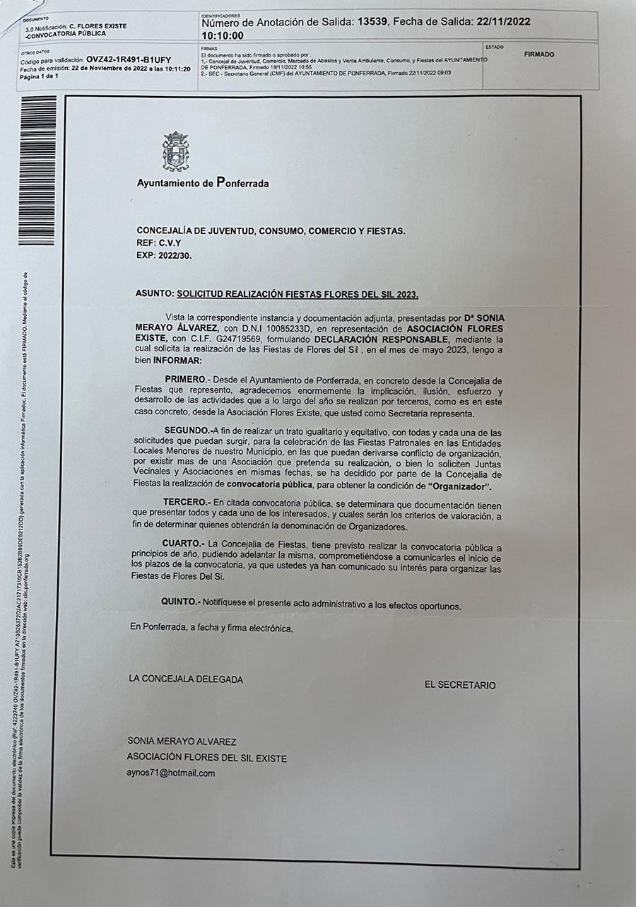Así, desde 'Flores del Sil Existe' avanzan que será la Asociación de Vecinos de Flores del Sil 'Pajariel' la que se encargue de llevar a cabo las citas de celebración del próximo mes de mayo, aún siendo 'Flores del Sil Existe' "la primera" en haber solicitado la organización, "ya el pasado mes de julio", concretamente "el 7 de julio de 2022. Desde la entidad vecinal, defienden haber "luchado" por la organización de los festejos, como también "haber intentado llegar a un acuerdo con la otra asociación", de la que además proceden con anterioridad, y que su salida de Asociación de Vecinos de Flores del Sil 'Pajariel' catapultó a la creación de la nueva asociación que este martes, 4 de abril, ha querido mostrar su situación para con el barrio y el Ayuntamiento de Ponferrada, que consideran "juego sucio". Además, Prada y Merayo han querido resaltar "el mutismo" del Ayuntamiento de Ponferrada, ya que según su declaración "son muchas las instancias que no nos han contestado. No entendemos el silencio de este Ayuntamiento". Además, han mostrado una carta remitida por la Concejalía de Fiestas donde expresan lo que ocurriría en caso de "conflicto" como lo que se está produciendo.