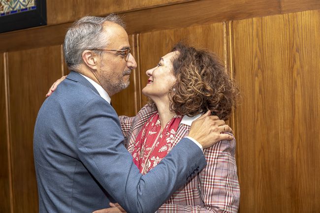 La alcaldesa en funciones, Gloria F. Merayo (PP), saluda al cabeza de lista del PSOE, Olegario Ramón, tras el pleno extraordinario / Mario de la Torre