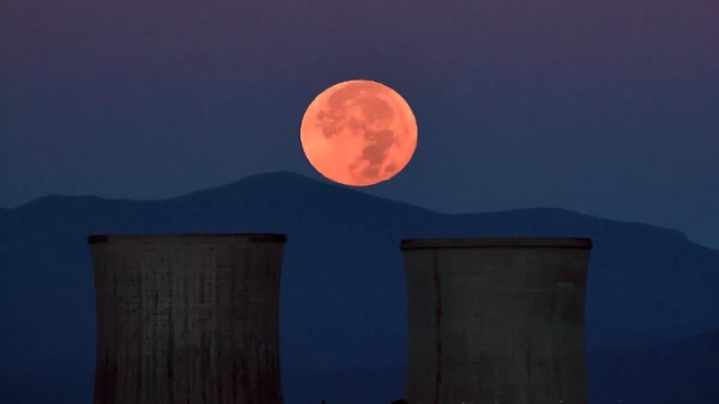 En la instantánea el fotógrafo berciano capturó una superluna entre las chimeneas de la antigua central de Compostilla, y remitió su trabajo al concurso internacional.