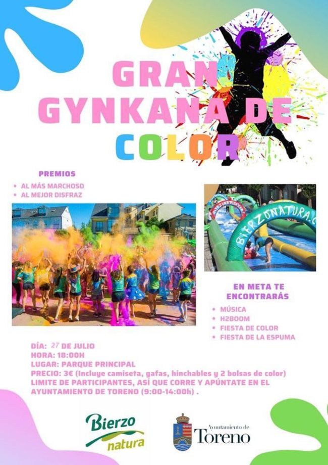 El Ayuntamiento de Toreno y la empesa de ocio Bierzo Natura organizan una 'Gran Gynkana de Color' que se celebrará en el parque principal de la localidad el próximo domingo 18 de agosto, a partir de las 18:00 horas. El más marchoso y el mejor disfraz se llevarán premios y, además de la fiesta del color, habrá música, hinchables y fiesta de la espuma.