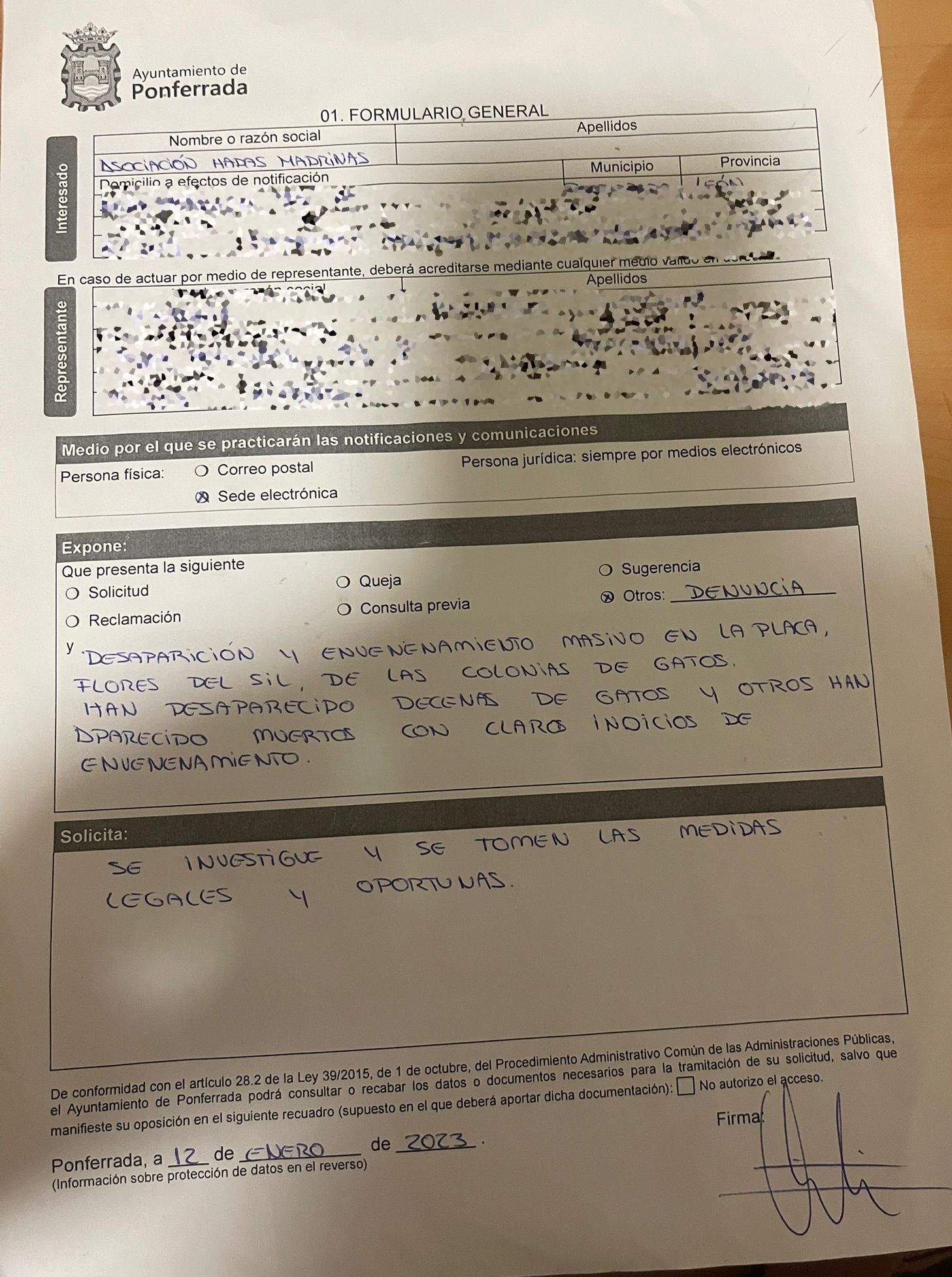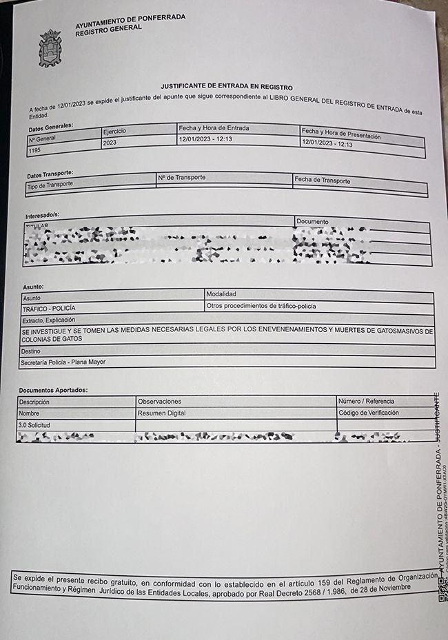 Foto: Cedia a InfoBierzo"Han desaparecido decenas de gatos y otros han aparecido muertos con claros indicios de envenamiento", afirman en el documento oficial remitido a la Policía de Ponferrada. Una documentación de trámite de denuncia que ha sido facilitada a InfoBierzo por la entidad denunciante.