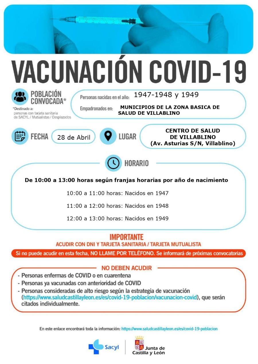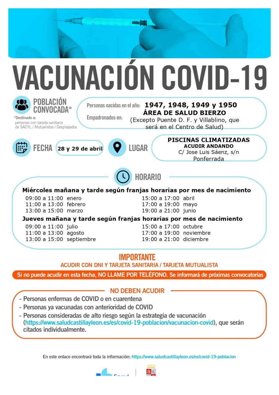 Por otra parte, la Gerencia de Asistencia Sanitaria del Bierzo también hace un llamamiento a todos los residentes de los municipios de la zona básica de salud de Villablino nacidos entre 1947 y 1951 para vacunarse los próximos días miércoles 28 y jueves 29 de abril.