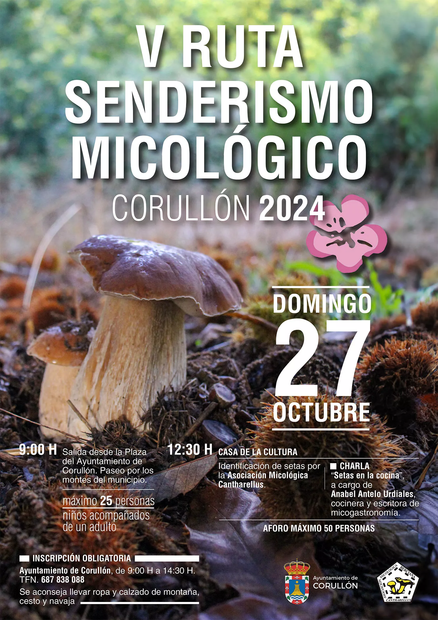 El domingo 27 de octubre, a las 9 horas y a las 12.30 horas se realizarán en el Ayuntamiento de Corullón dos actividades micológicas: una salida guiada para recoger setas por el monte y una charla sobre “Las setas en la cocina” a cargo de Anabel Antelo cocinera y escritora. La inscripción es obligatoria. Tfno.: 687838088 (de 9 a 14.30)