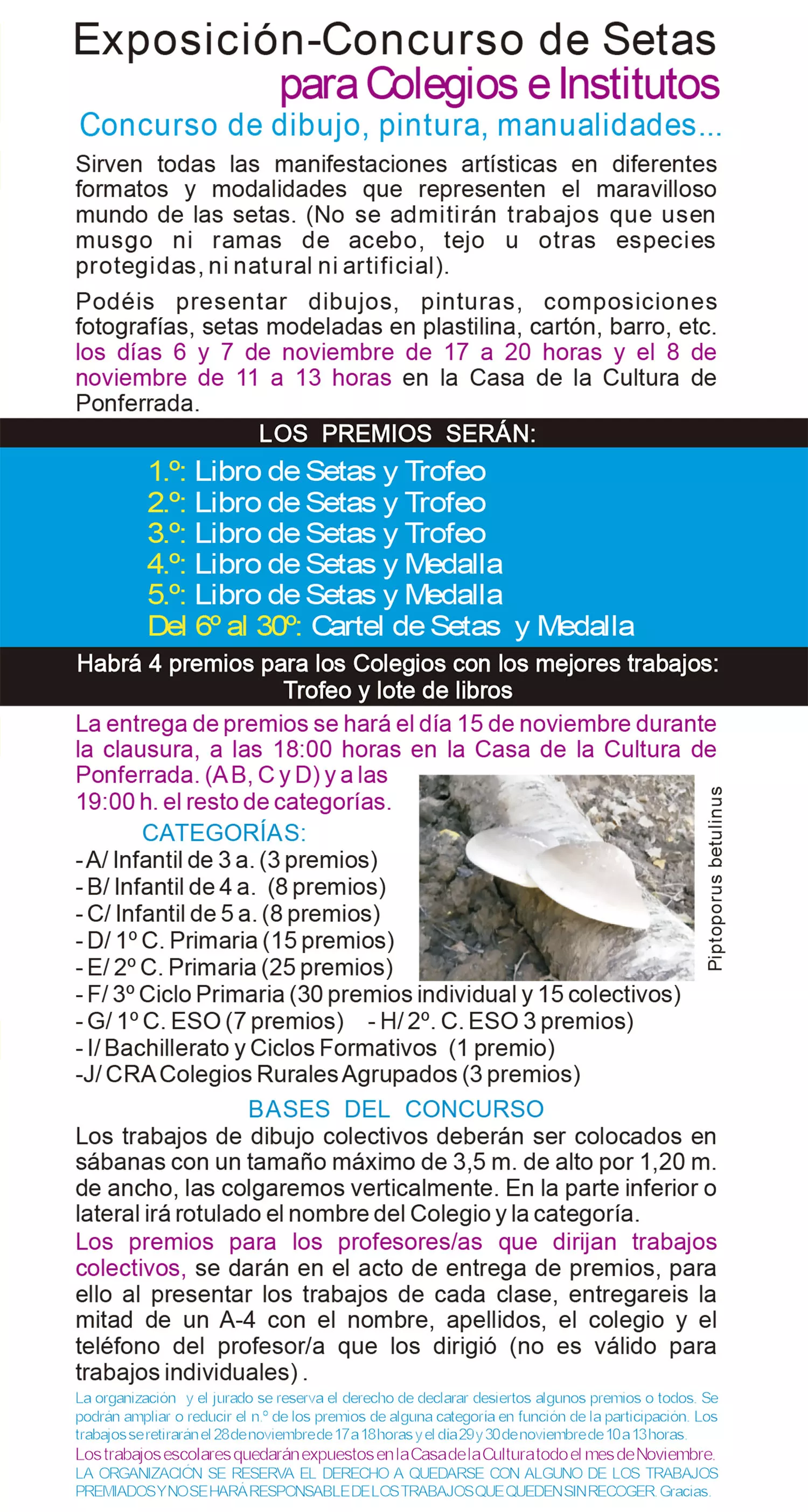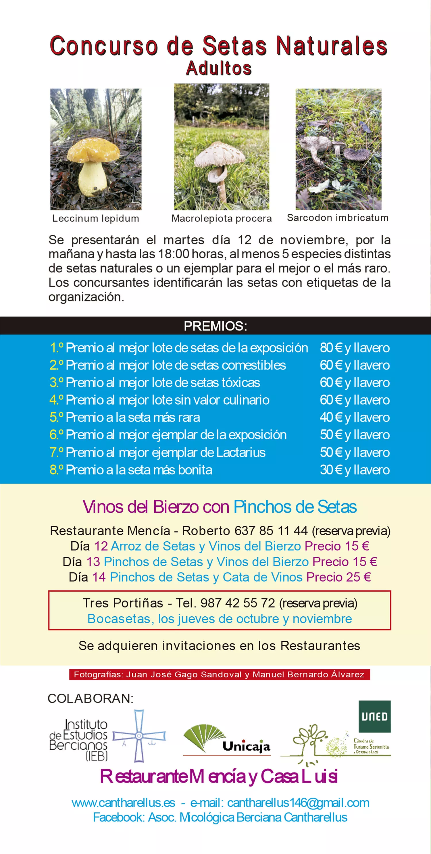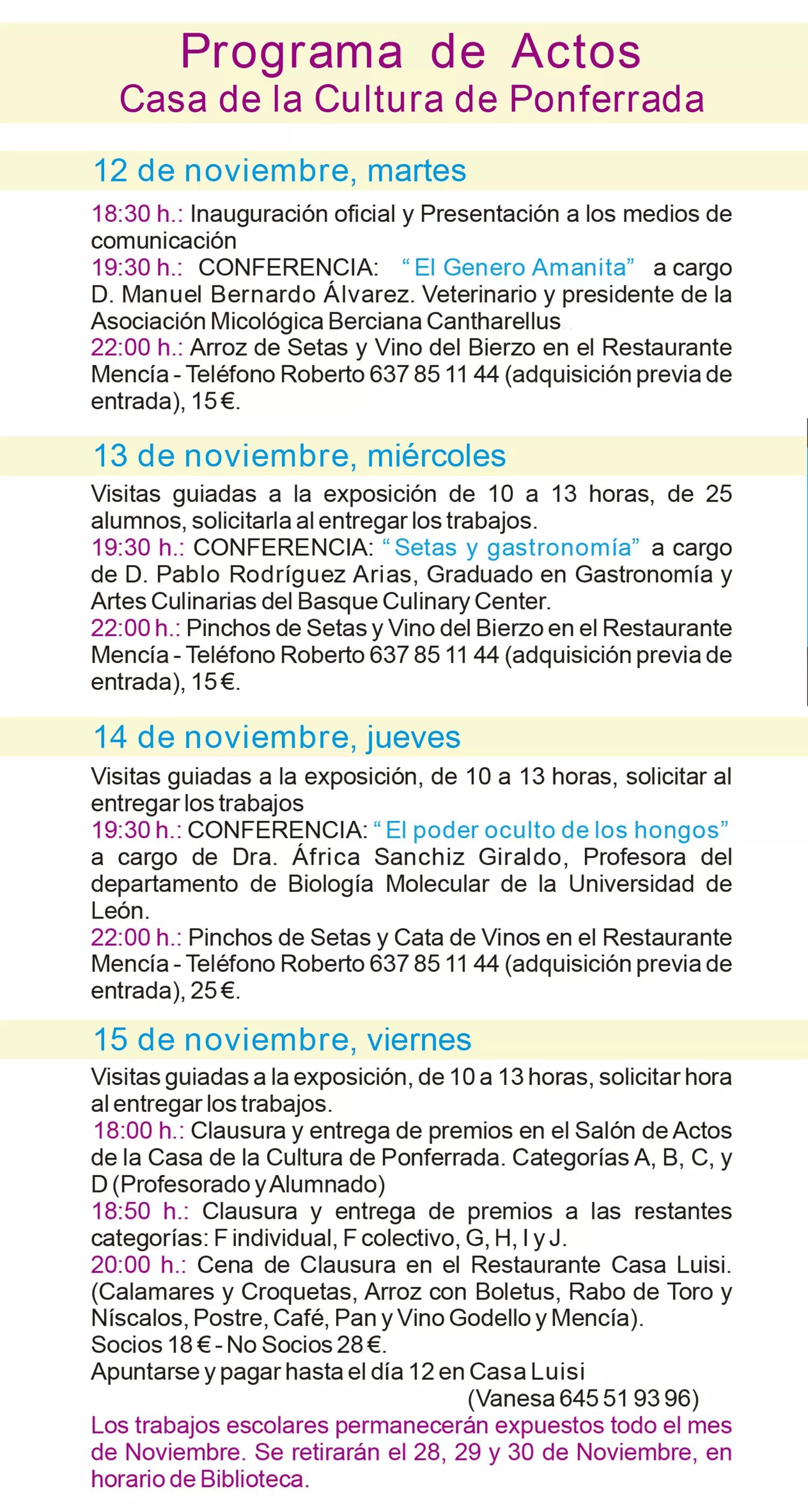 Las XXIX Jornadas Micológicas del Bierzo se celebrarán en la Casa de la Cultura de Ponferrada del 12 al 15 de noviembre. La exposición de los trabajos escolares permanecerá todo el mes de noviembre. Habrá Concurso de Setas Naturales. Tres conferencias, los días 12, 13 y 14, a las 19.30 horas. Y en los restaurantes Mencía, Casa Luisi y Tres Portiñas hay setas, vino, cata, bocasetas, gastronomía micológica a precios asequibles.