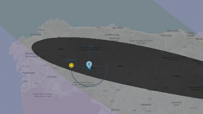 Desde el Instituto Geográfico Nacional se puede hacer una simulación del paso del eclipse por cualquier parte del país, concretamente por Ponferrada, tiene unos datos muy específicos; Inicio del eclipse (19:32:37), Inicio de la totalidad (20:28:39), Máximo (20:30:05) y Fin del eclipse (21:22:30). Puedes comprobar cualquier simulación pinchando AQUÍ.