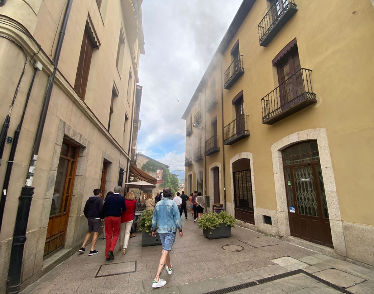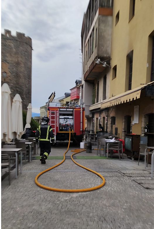 La escena irrumpió en el corazón del casco antiguo ante el paseo de viandantes y turistas. El humo salía por la fachada del restaurante apostado frente al Castillo, y se extendía hacia el exterior, poniendo sobre alerta a los presentes sobre las 19.30h. de este sábado.