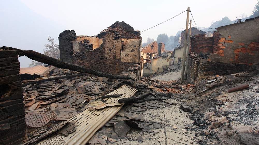 Hoy, el corazón de Lusio está reducido a escombros. Calles cubiertas de ceniza, muros derruidos, tejados colapsados y árboles carbonizados forman un escenario que recuerda más a una zona de guerra que a un pueblo rural. En medio de esa desolación, una figura solitaria se mueve entre los restos calcinados: un hombre de avanzada edad recoge algunas pertenencias que han quedado en lo que fue su hogar.