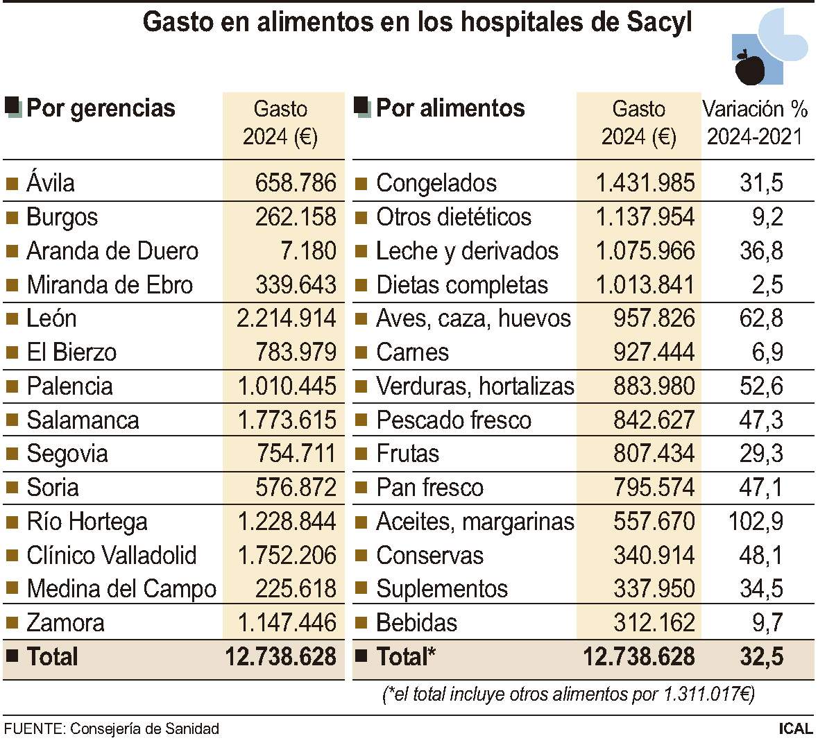 Los hospitales de Sacyl invirtieron en el último año 12,7 millones de euros en alimentar a sus pacientes, un presupuesto que desde finales de la pandemia se ha disparado un 32,5%, debido al incremento del precio de los alimentos, pero también a la mejora de las dietas y al aumento de la calidad nutricional de los menús, que en un hospital exigen ser equilibrados y adaptarse a las necesidades de los pacientes. No en vano, por ejemplo, sólo en el último año, los complejos asistenciales dedicaron 337.950 euros a suplementos alimenticios, 19.881 euros a tarritos y preparados infantiles, y hasta 11.925 euros a papillas para bebés. El gasto en leche infantil se elevó a 43.735 euros.