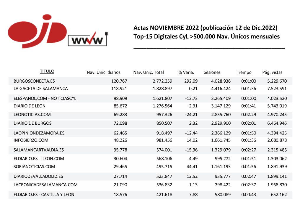 En base a las más de 60 cabeceras de digitales nativos y webs de diarios de papel auditadas por OJD en Castilla y León, InfoBierzo se mantiene en el top-10.