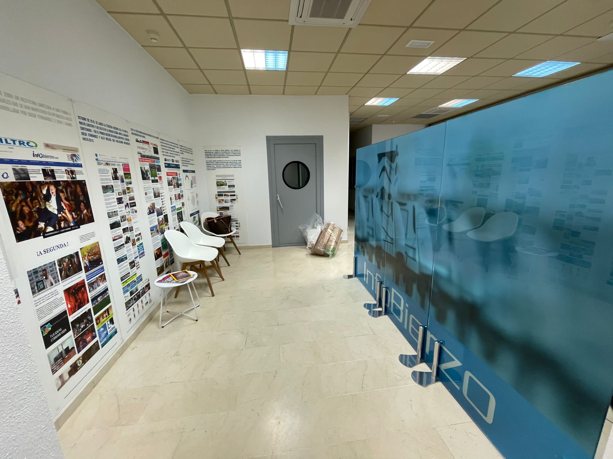 La entrada recoge en varios paneles la evolución del diseño de InfoBiero.com en sus 6 versiones desde la fundación el 8 de octubre de 2007. Este pasillo de acceso a la sala principal de redacción. con varias pantallas que referencian los contenidos, lectores online y contenido en visualización, ubicación en tiempo real de la audiencia así como su soporte de consumo, control de notificaciones a móviles etc... Pantallas que se despliegan junto a la alargada mesa de redactores, también llamada 'el taller' de contenidos.