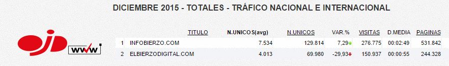 Con estos datos InfoBierzo puede observar una auditoría que certifica que casi duplica en audiencia a Elbierzodigital. Con 7.534 lectores únicos al día para InfoBierzo por 4.013 de elbierzodigital (marcaban en el acta corregida 5.070). En visitas totales InfoBierzo marca 276.775 por 150.937 de este competidor; 2.49 minutos de permanencia en InfoBierzo por 55 segundos en Elbierzodigital; y 531.842 páginas vistas al mes por 244.328 del competidor, al que se duplica en este apartado.