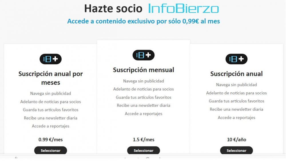 Una de las novedades más esperadas en InfoBierzo llega desde hoy. La evolución de CMS lanzado hace menos de un mes ya había avanzado la disponibilidad del lector-socio. Sin anuncios por menos de lo que vale un café al mes; y bastante menos: 0.99 euros.